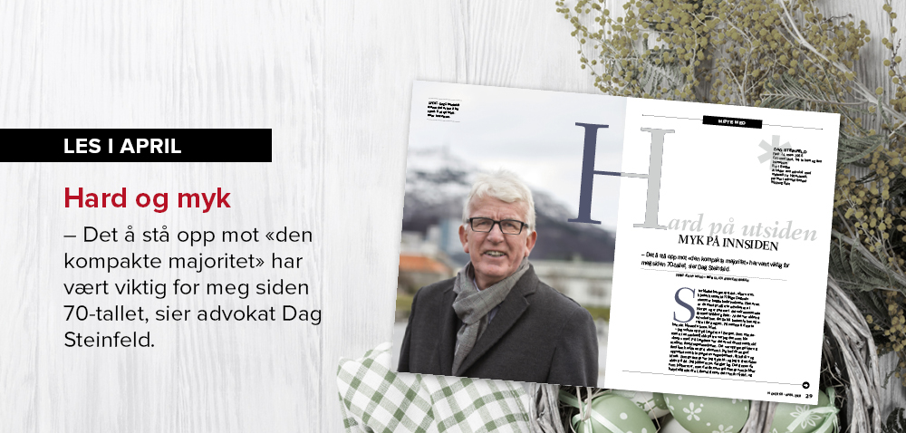 Møte med: Storkjeftet bergenser eller varmhjertet humanist? Les om advokat Dag Steinfeld i vår aprilutgave. Selv sier han: – Det å stå opp mot «den kompakte majoritet» har vært viktig for meg siden 70-tallet.