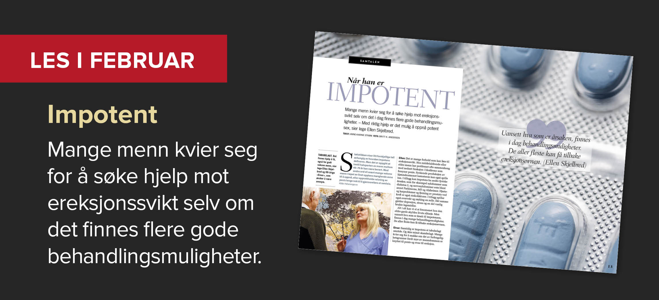 Samtalen: Mange menn kvier seg for å søke hjelp mot ereksjonssvikt selv om det i dag finnes flere gode behandlingsmuligheter. – Med riktig hjelp er det mulig å oppnå potent sex, sier lege Ellen Skjelbred.
